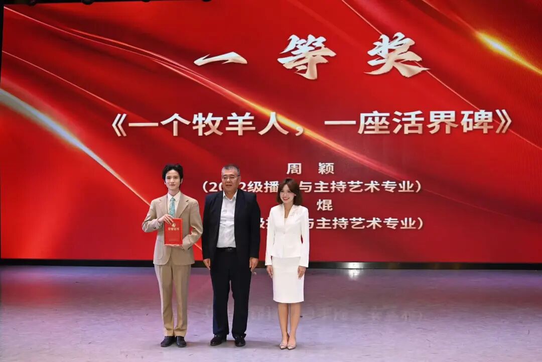 (图为新疆艺术学院传媒学院播音专业教师集体为优秀奖选手颁奖)