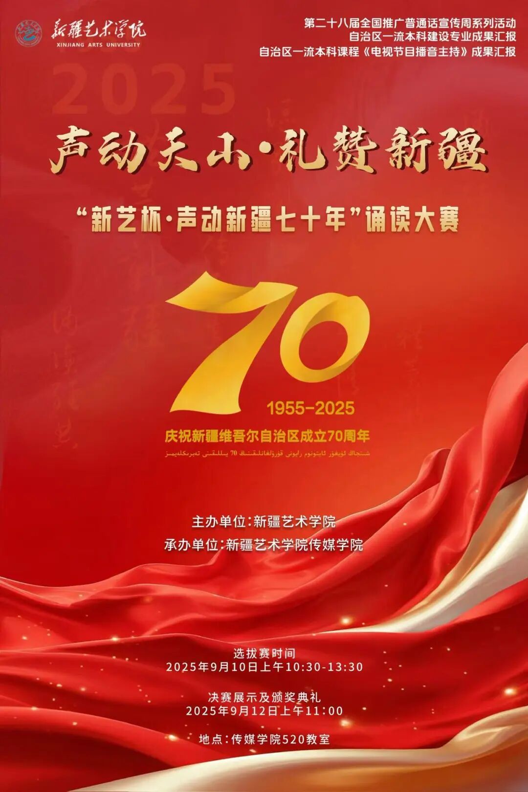 为热烈庆祝新疆维吾尔自治区成立七十周年,深情回顾光辉历程,生动展现发展成就,凝聚团结奋斗力量,新疆艺术学院传媒学院将于2025年9月10日举办“新艺杯·声动新疆七十年”诵读大赛。欢迎全校学生积极报名,踊跃参赛!