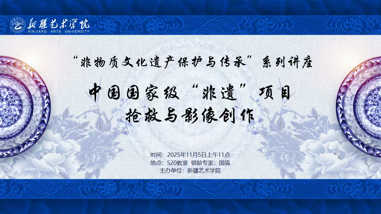 2025年11月5日,新疆艺术学院传媒学院教授、硕士生导师国盾先生应邀开讲——“中国国家级‘非遗’项目抢救与影像创作”。作为中国电视艺术家协会与新疆电视艺术家协会双料会员,国盾教授以田野与讲台并重的深厚履历,为在座师生揭示了非物质文化遗产在影像记录与创作中的独特价值。