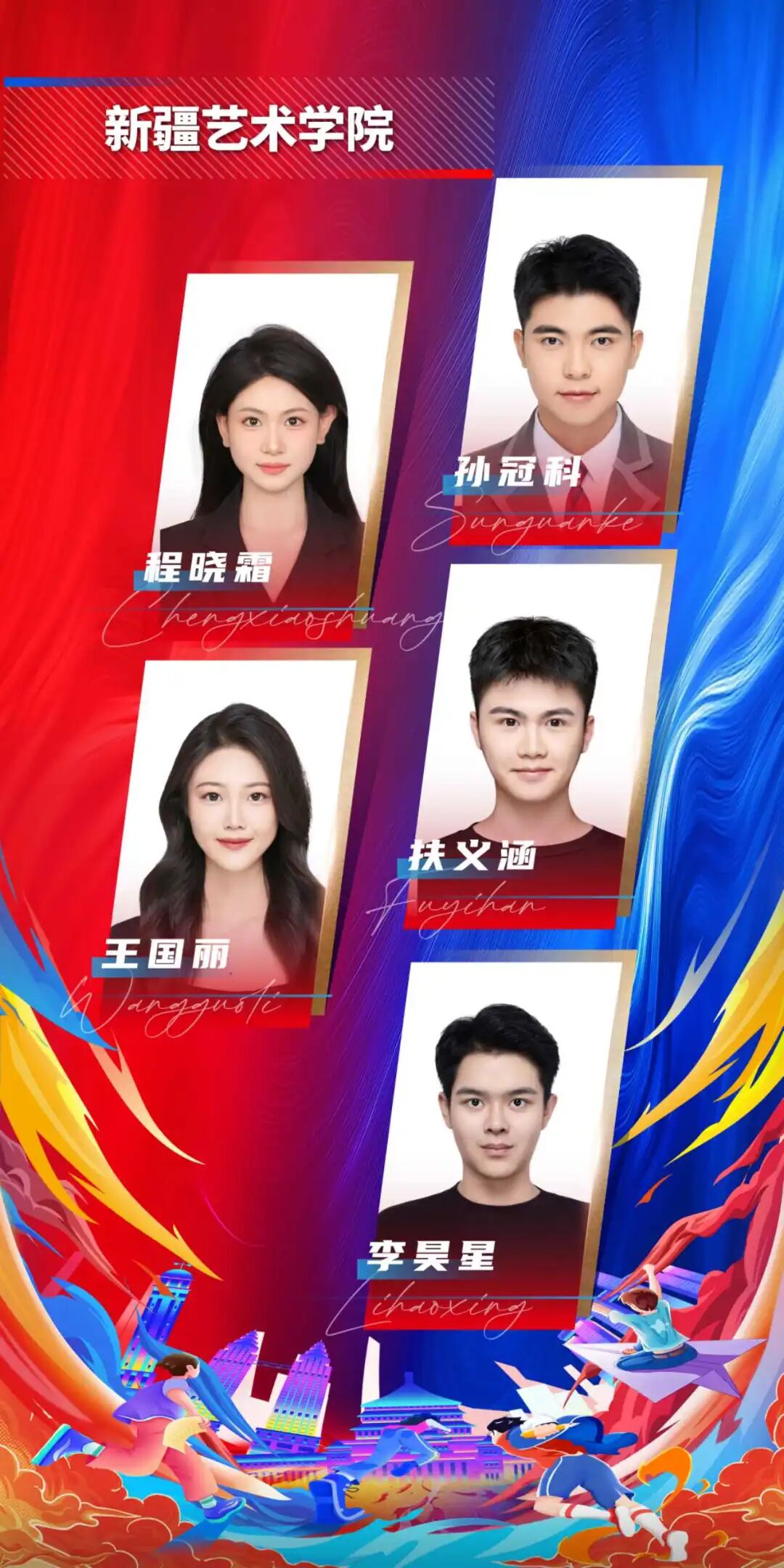新疆艺术学院派出由2025级播音主持研究方向研究生李昊星、孙冠科、程晓霜,2024级播音主持研究方向研究生扶义涵,以及2023级播音与主持艺术专业王国丽组成的五人代表队,代表新疆高校出战。