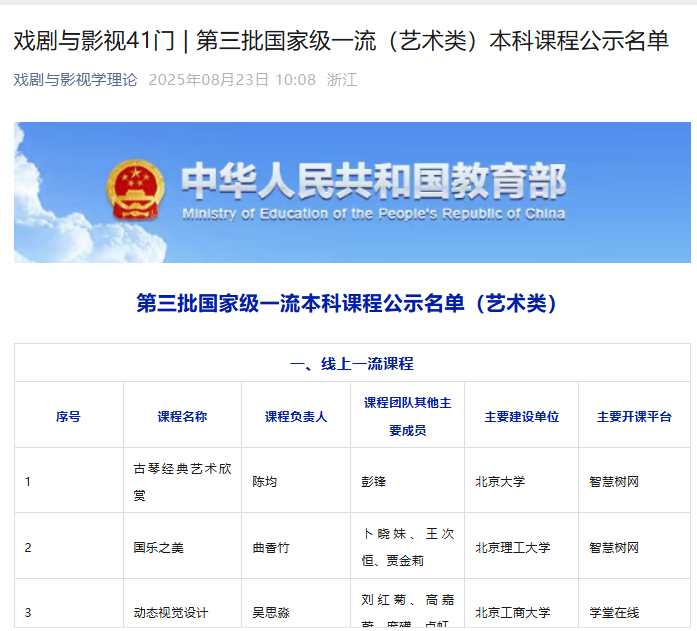 2025年8月,教育部公布《第三批国家级一流本科课程认定结果公示》,我院摄影动画系黄婧副教授领衔的《主旋律短视频创作》课程成功入选国家级社会实践一流本科课程。
