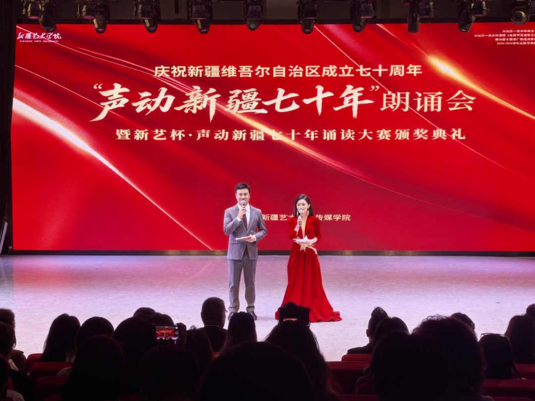2025年9月17日下午,新疆艺术学院传媒学院隆重举行“声动新疆七十年”朗诵会暨“新艺杯·声动新疆七十年”诵读大赛颁奖典礼,以庆祝新疆维吾尔自治区成立七十周年,迎接第28届全国推广普通话宣传周。本次活动同时也是2024-2025学年实践学期成果的综合展示,学生通过深情朗诵和生动演绎,回顾新疆七十载辉煌历程,展示经济社会发展巨大成就,进一步凝聚团结奋进力量。
