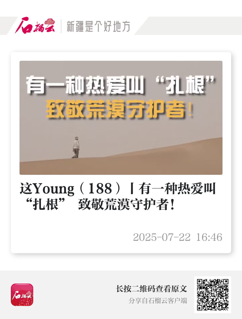 塔克拉玛干烈日下,传媒学院学子扛起镜头,拍摄完成《这Young》第188期《有一种热爱叫“扎根” 致敬荒漠守护者!》,用镜头讲述荒漠植物守护者张波的“扎根”故事。