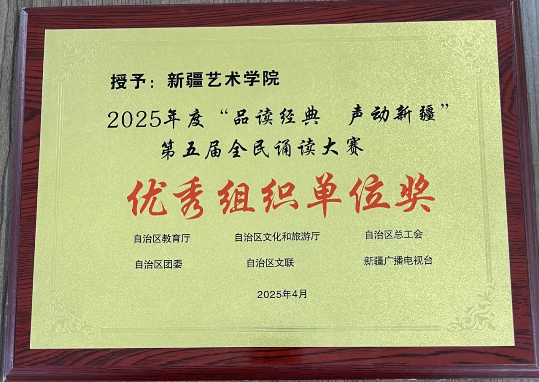 赓续中华文脉、展示经典魅力。2025年4月22日,由新疆广播电视台联合自治区党委教育工委、自治区教育厅、自治区文化和旅游厅、自治区总工会、自治区团委、自治区文联共同主办的“品读经典·声动新疆”第五届全民诵读大赛颁奖典礼在哈密南粤文化中心圆满落幕。大赛自2021年以来已举办五届,本届大赛从2025年3月28日起以全媒体线上和线下结合的方式开展海选、初赛、复赛、决赛。据悉,本届大赛官方报道触达量首次突破千万人次。经过激烈角逐,475组作品筛选进入初赛,250件作品进入复赛,共157件作品进入决赛,新疆艺术学院24件作品进入决赛并分获各类奖项。