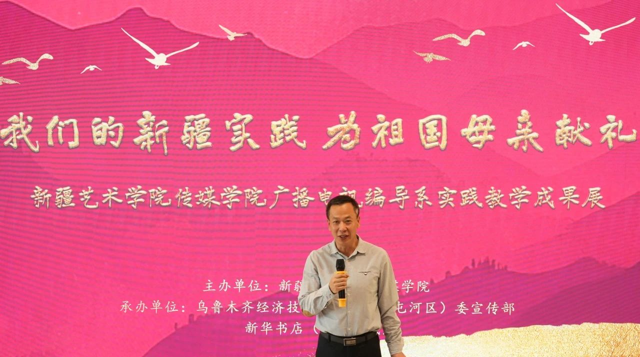 传媒学院党委书记赵建伟在致辞中谈到,正值全国学习二十届三中全会精神、全区推进中国式现代化新疆实践之际,传媒学院师生在学校党委的坚强领导下,也在用自己的实际行动加入到“文化润疆”的大军中来,创作出一大批“沾泥土”“带露珠”“冒热气”的作品,这是新疆艺术学院传媒学院在新的时代背景下,注重培养应用型传媒创新人才,为服务新疆的文化发展、经济发展和社会发展做出的具体实践。