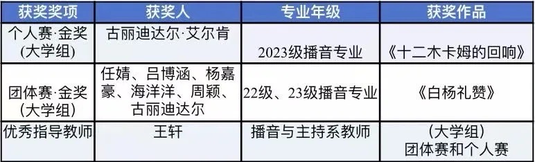 指导教师王轩谈到:“这次两个组别均获得了金奖,对同学们的认可和鼓励意义特别重要。这不仅是对新疆艺术学院播音专业教学质量的肯定,也体现了我校学子良好的精神风貌和专业素养,同时,对推动我校乃至新疆的文化建设和民族团结教育具有积极意义,激励着更多青年学子投身于中华民族伟大复兴的实践中。”