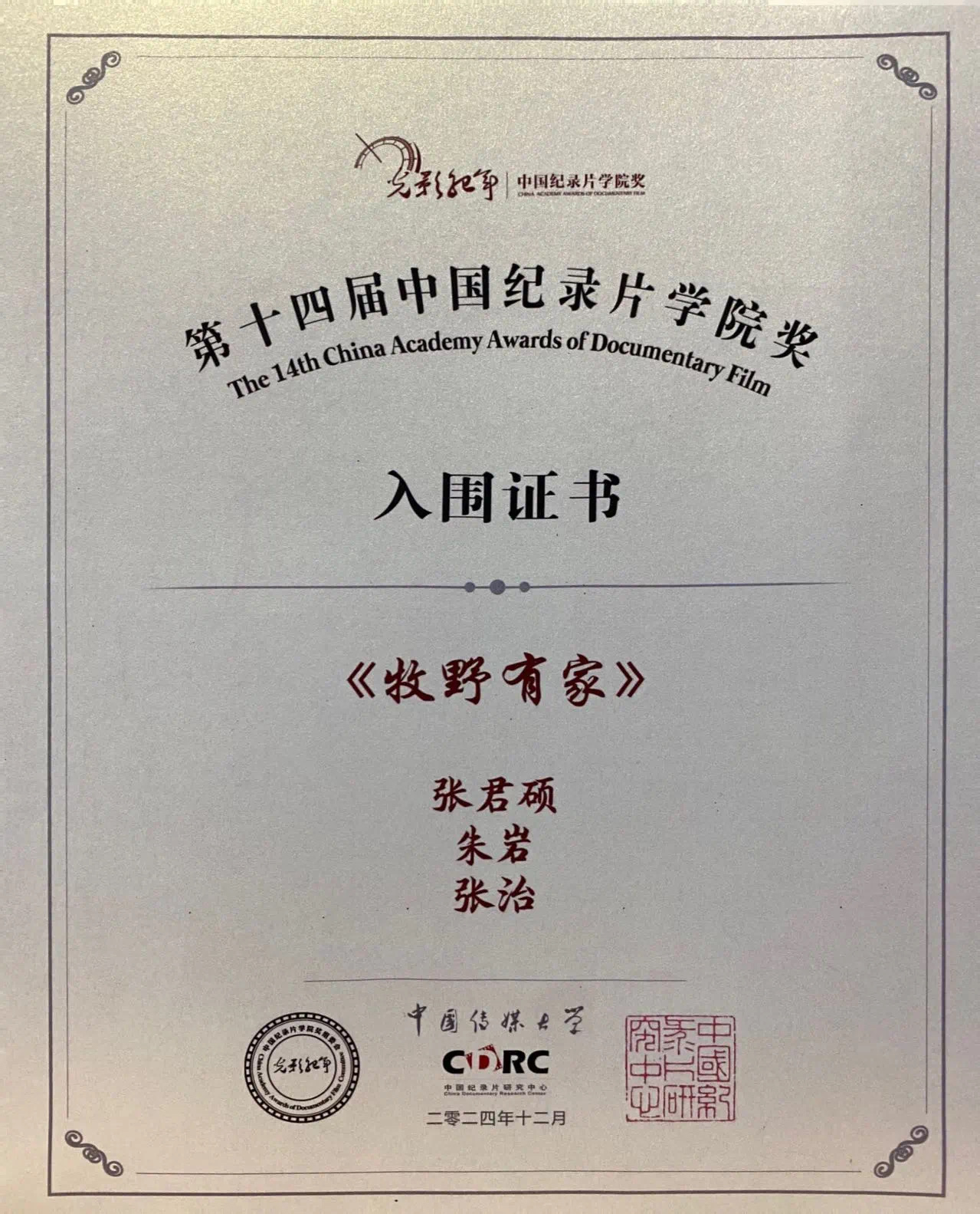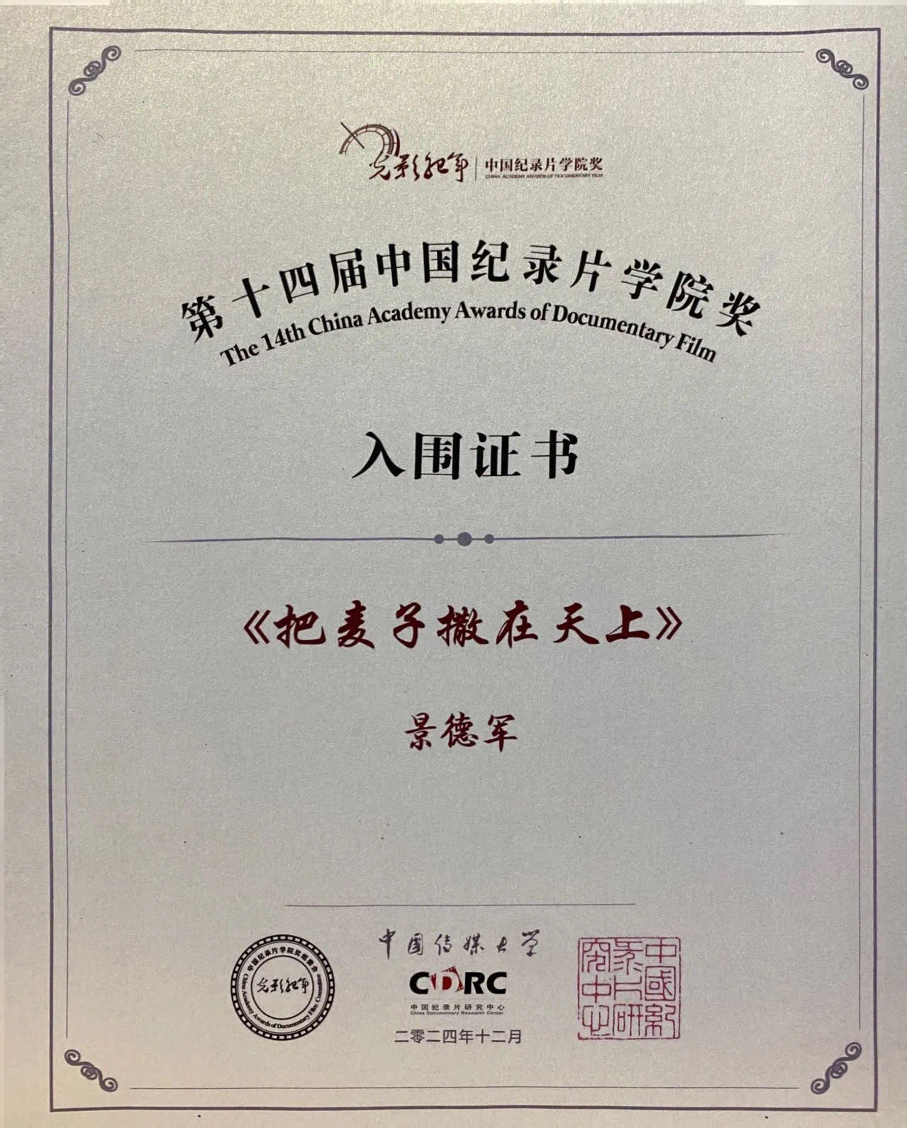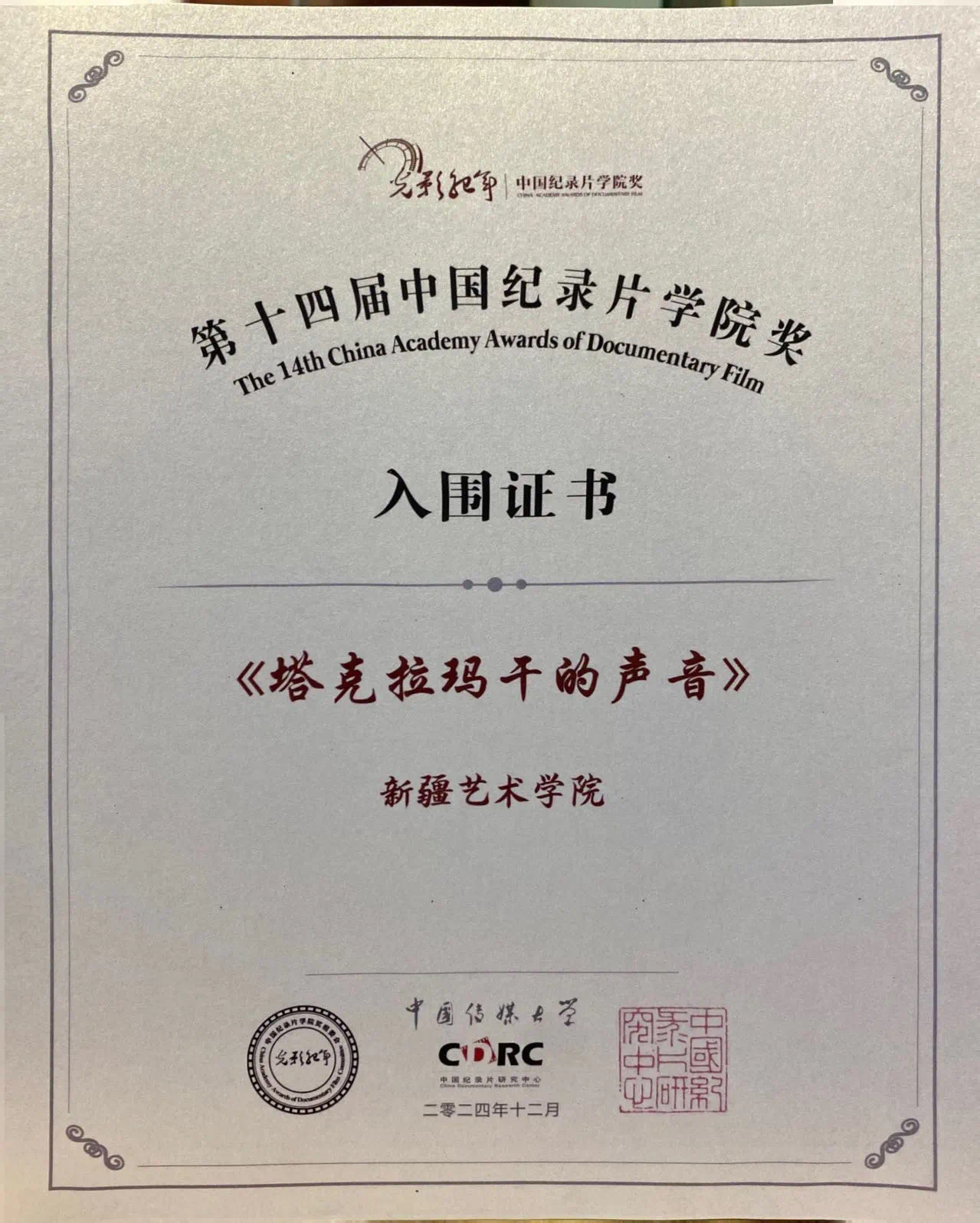 12月26日,在学院奖组委会和全体评审专家的共同努力下,第十四届“光影纪年”——中国纪录片学院奖入围名单新鲜出炉。新疆艺术学院传媒学院广播电视编导系三部师生作品入围终评,分别为:广播电视编导系景德军副教授的作品《把麦子撒在天上》,2020级广播电视编导班穆斯塔帕·穆提拉、2020级新媒体班张佚哲的作品《塔克拉玛干的声音》,2021级广播电视编导班张君硕的作品《牧野有家》。