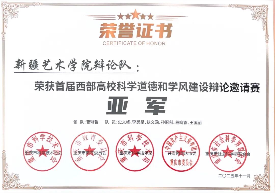 11月7日至8日,首届西部高校科学道德和学风建设辩论邀请赛在重庆理工大学成功举行。新疆艺术学院辩论队在此次比赛中获得亚军