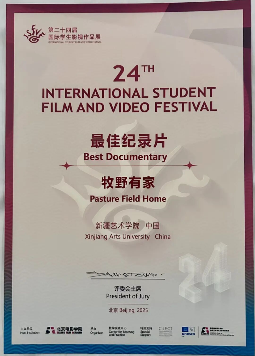 近日,新疆艺术学院传媒学院学生的纪录片作品《牧野有家》(Pasture Field Home)在第二十四届ISFVF国际学生影视作品展中凭借深刻的主题表达与细腻的镜头语言,成功从全球众多佳作中脱颖而出,获得本届影展纪录单元唯一最高奖——最佳纪录片。