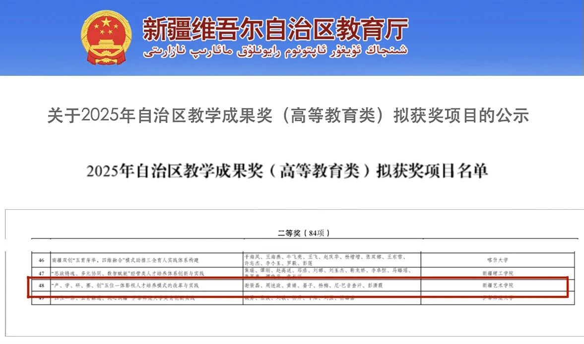 近日,2025年新疆维吾尔自治区教学成果奖(高等教育类)获奖名单正式公布。我院摄影动画系谢荣磊教师带领的团队,其教学成果《“产、学、研、赛、创”五位一体影视人才培养模式的改革与实践》荣获二等奖!获奖团队成员包括:谢荣磊、周述政、黄婧、晏子、杨梅、尼·巴音查汗、彭潇霞。