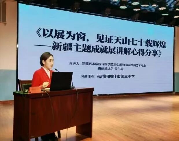 我院播音与主持艺术专业学生古丽迪达尔·艾尔肯以《讲好新疆故事:我在自治区成立70周年主题成就展中的坚守与感动》为题,为师生们作了专题分享,她以视听为媒共话城市的变迁与发展。作为自治区成立70周年主题成就展的优秀讲解员,与师生们分享自承担讲解任务以来的心路历程。她从初次接触讲解工作时的生涩紧张,到通过持续学习和刻苦练习,最终在舞台上绽放自信与风采,这段真实的成长经历深深打动了在场的每一位孩子,让他们看到了坚持与努力的意义。