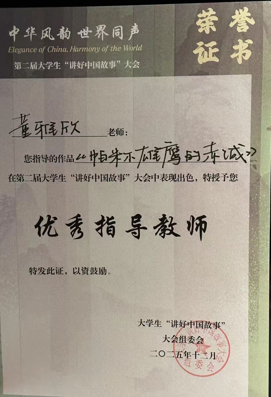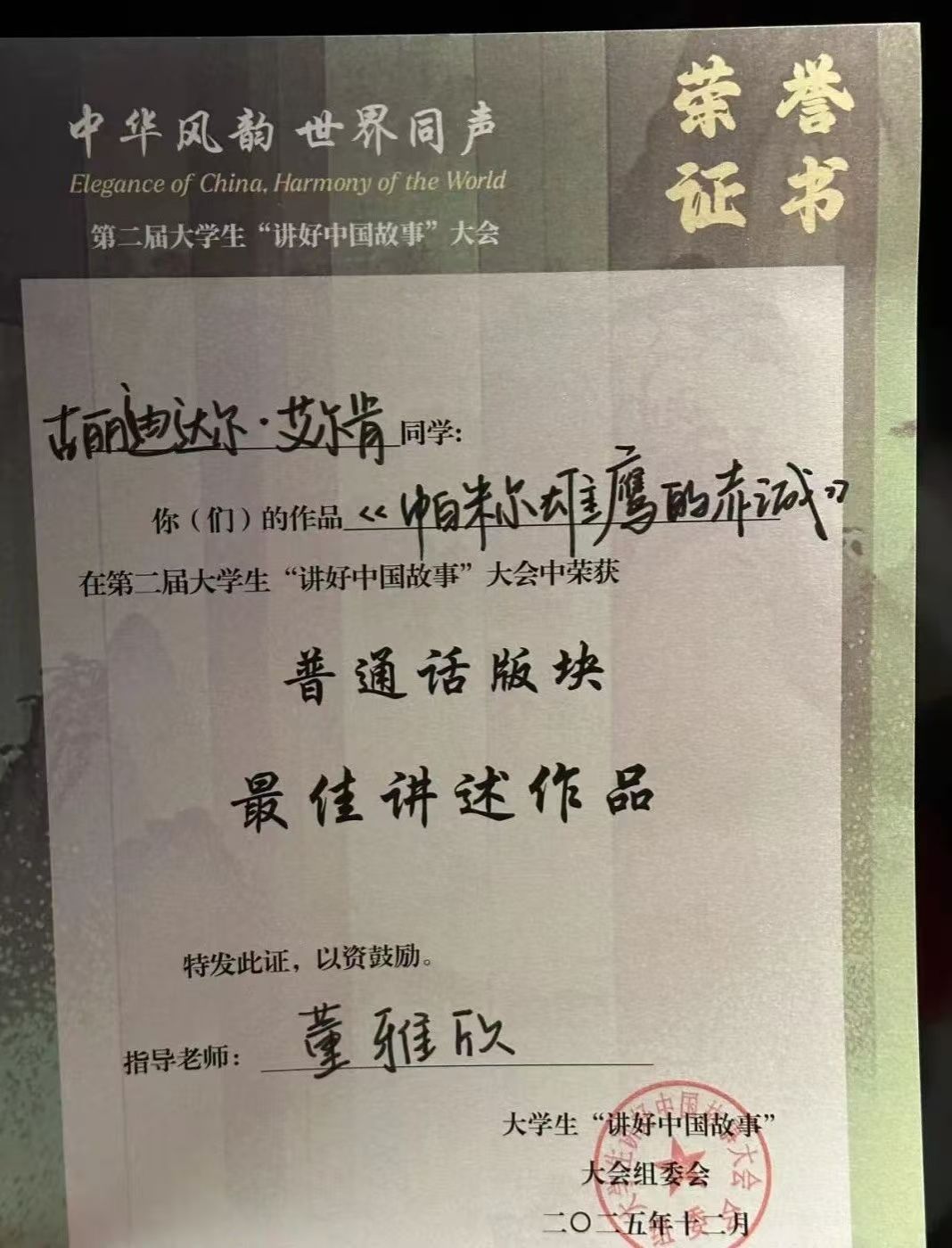 在第二届大学生“讲好中国故事”大会上,我院播音与主持艺术系学子古丽迪达尔·艾尔肯凭借作品《帕米尔雄鹰的赤诚》脱颖而出,斩获最佳讲述作品奖。同时,董雅欣老师获评优秀指导教师。
