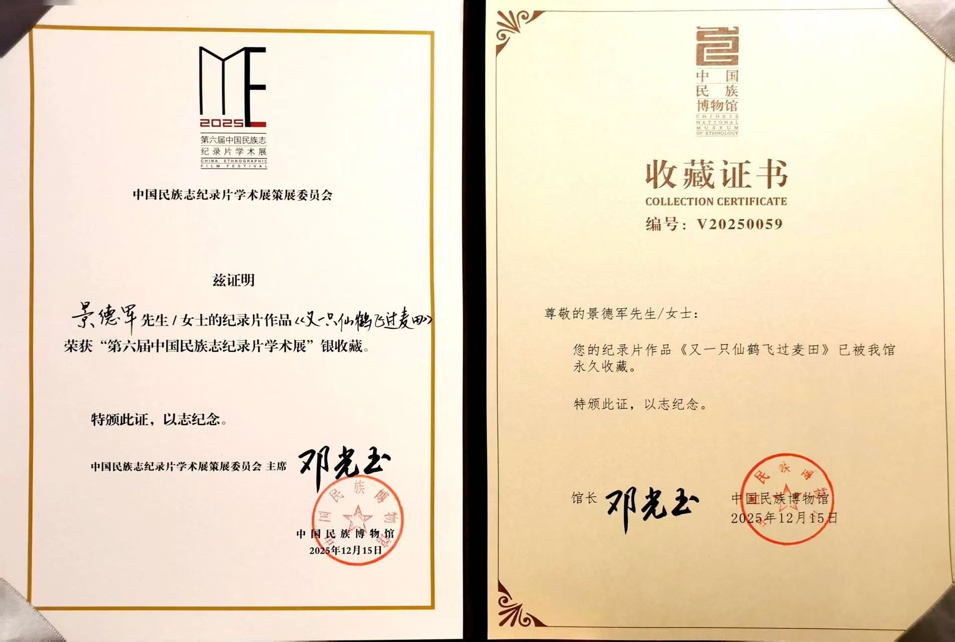 我院景德军教师的纪录片作品《又一只仙鹤飞过麦田》荣获第六届中国民族志纪录片学术展银收藏作品。