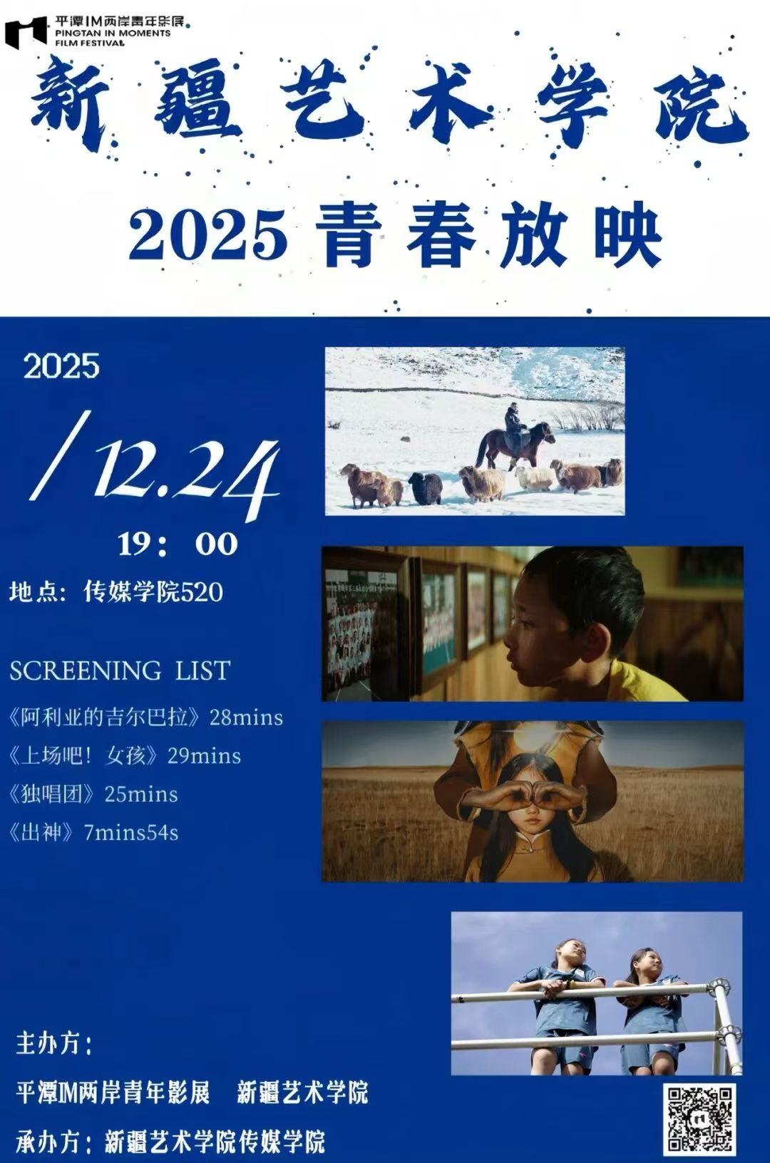 平潭IM两岸青年影展·青春放映携手新疆艺术学院传媒学院,定于12月24日在新疆艺术学院传媒学院520智慧教室开展2025年度的青春放映活动。