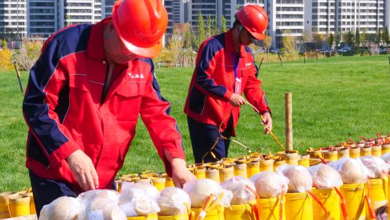 (图7 专业技术人员在安装不同花型的礼花)