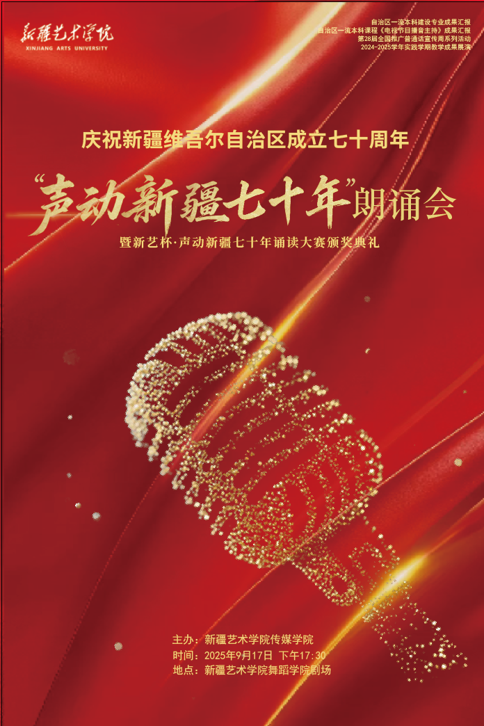 为热烈庆祝新疆维吾尔自治区成立七十周年,深情回顾光辉历程,生动展现发展成就,凝聚团结奋斗力量,同时迎接第28届全国推广普通话宣传周的到来,新疆艺术学院传媒学院将于2025年9月17日举办“声动新疆七十年”朗诵会暨新艺杯·声动新疆七十年诵读大赛颁奖典礼,欢迎全校师生前来观看,一起共享这份精彩与喜悦!