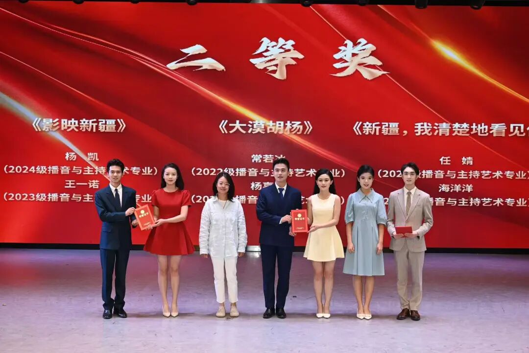 图为新疆艺术学院传媒学院播音专业教师集体为优秀奖选手颁奖)