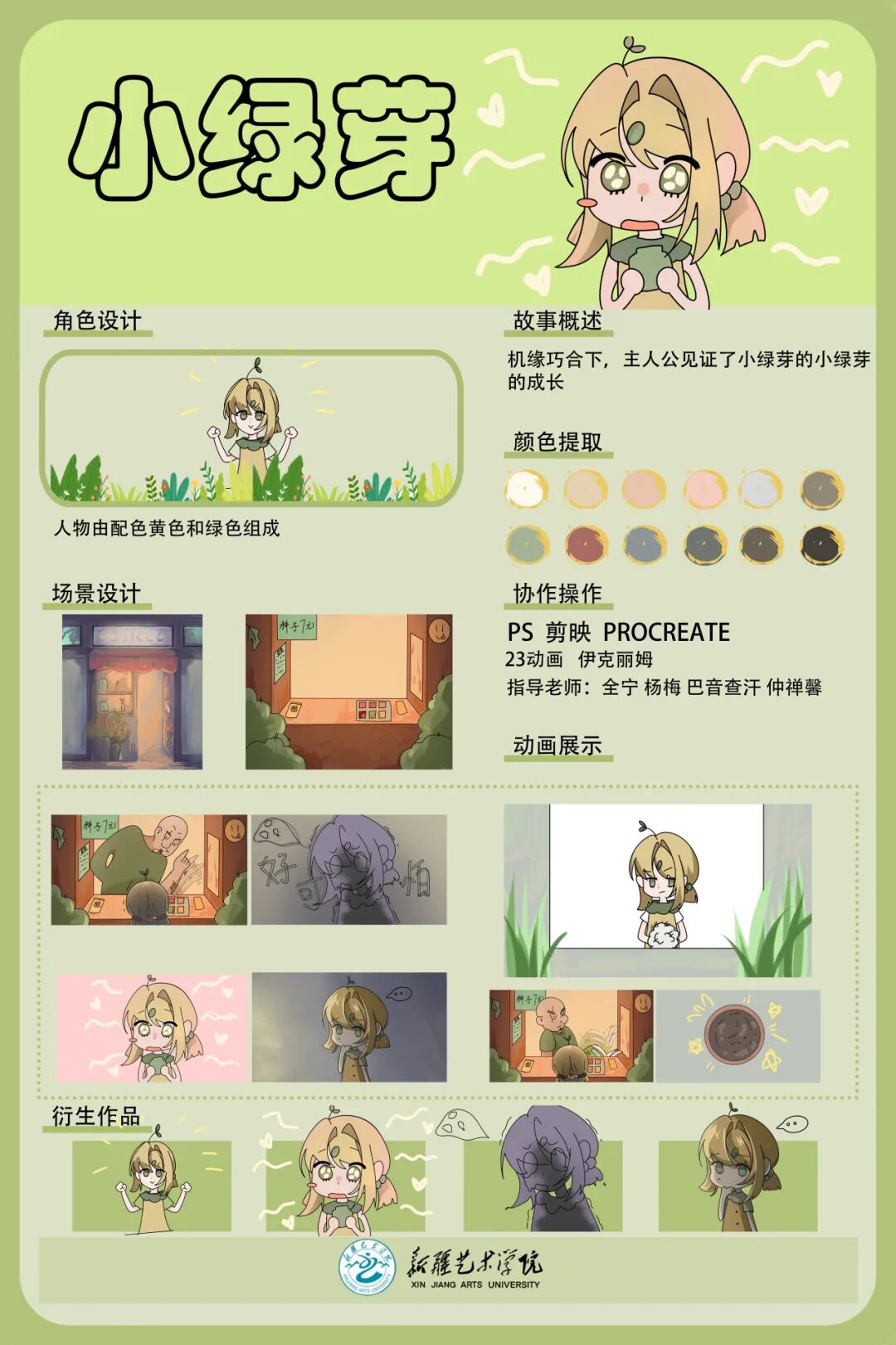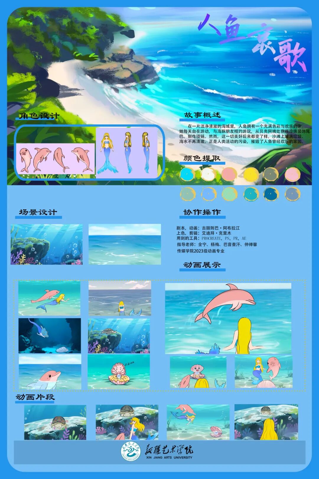 此次实践作品展分视频和平面两个部分,视频部分共展出动画短片、微纪录片、AI短片、音乐学院、设计学院、文化艺术学院宣传片等50余部作品,平面部分展出摄影作品30幅,动画设计类作品30余幅,海报50余张。