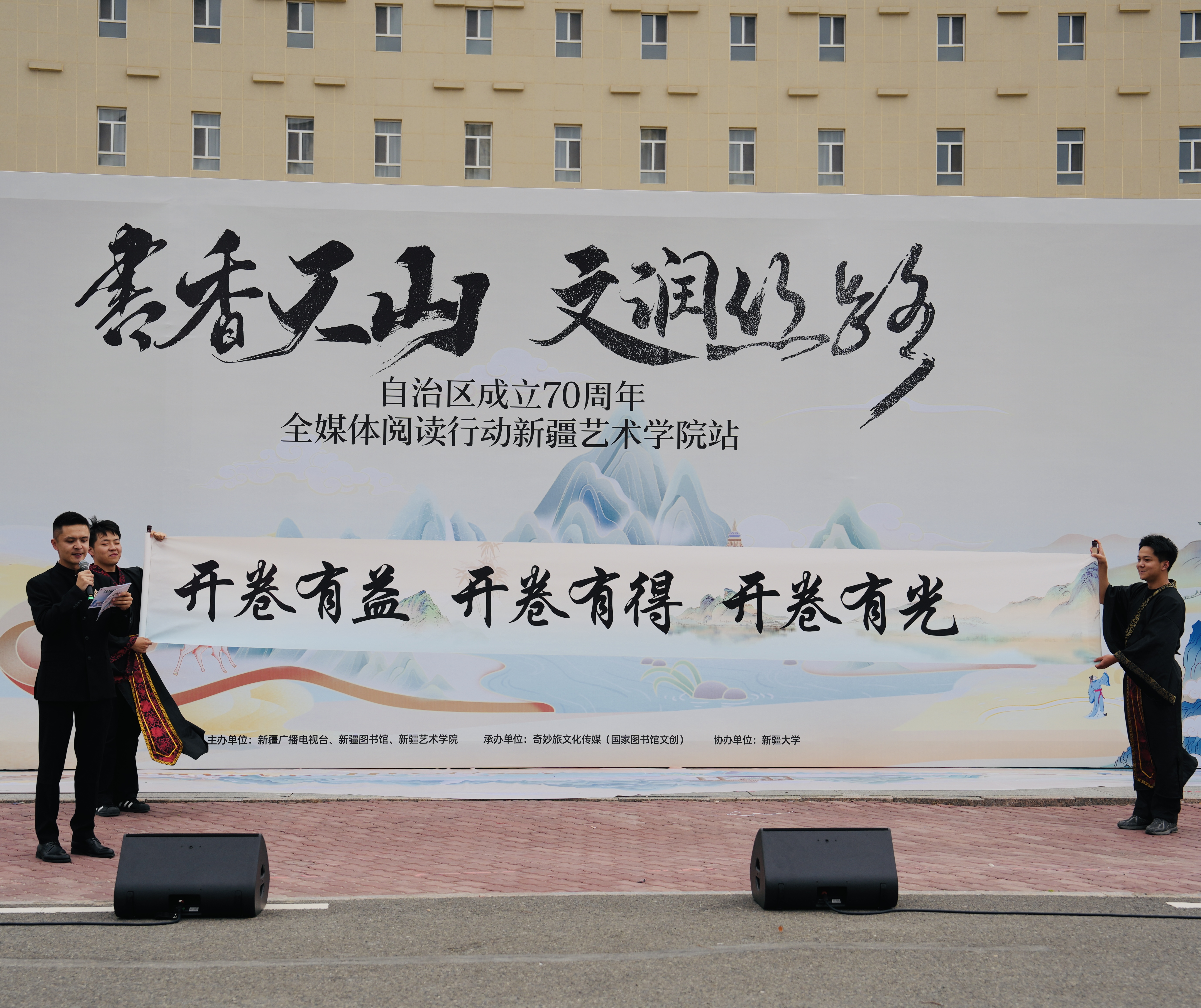 活动伊始,由新疆艺术学院传媒学院播音与主持艺术专业的志愿者们展开一幅巨型卷轴,“开卷有益、开卷有德、开卷有光”十二个大字熠熠生辉。在诵读环节,新艺之声——小石榴籽朗诵团以声音为舟,带我们穿越古今,阅读经典文学作品中的新疆。在同学们激昂的语调中,从李白笔下的雄浑山河,到李娟细腻描绘的草原风光,从刘亮程文字里流淌的乡土静谧,到茅盾《白杨礼赞》中挺拔向上的精神象征,多面新疆徐徐展开。