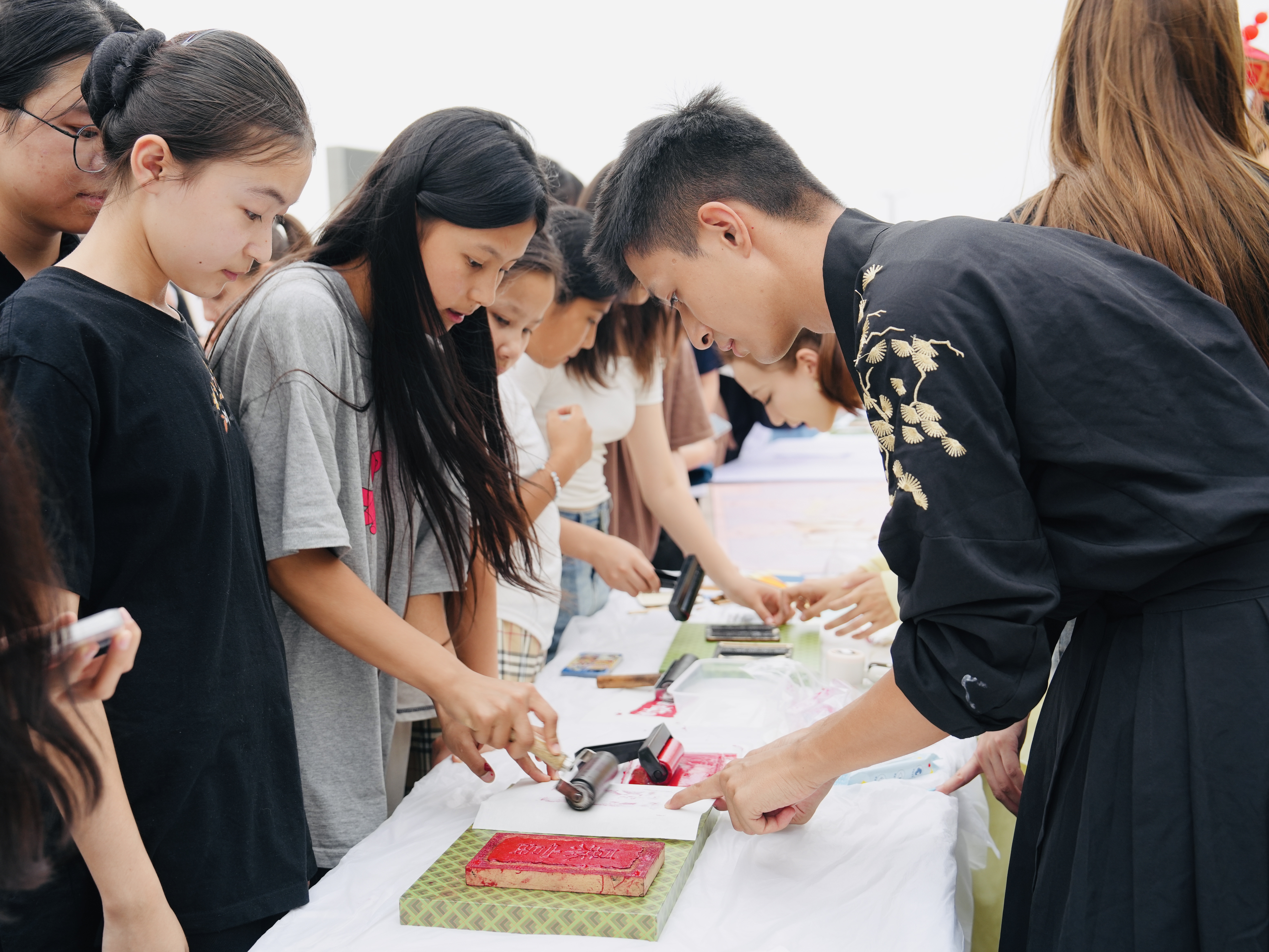 活动现场还设置了多个传统文化体验区,由新疆艺术学院传媒学院播音与主持艺术专业学生担任时光街区志愿者,带领同学们体验活字印刷、古籍修复、诗词飞花令等项目。在活字印刷区,同学们亲手操作活字工具,将古老的印刷技艺重现;古籍修复台前,志愿者们耐心指导同学们修复破损的线装书,让大家了解到古籍保护的重要性。这些沉浸式体验,让传统文化的独特魅力在实践中得以彰显。