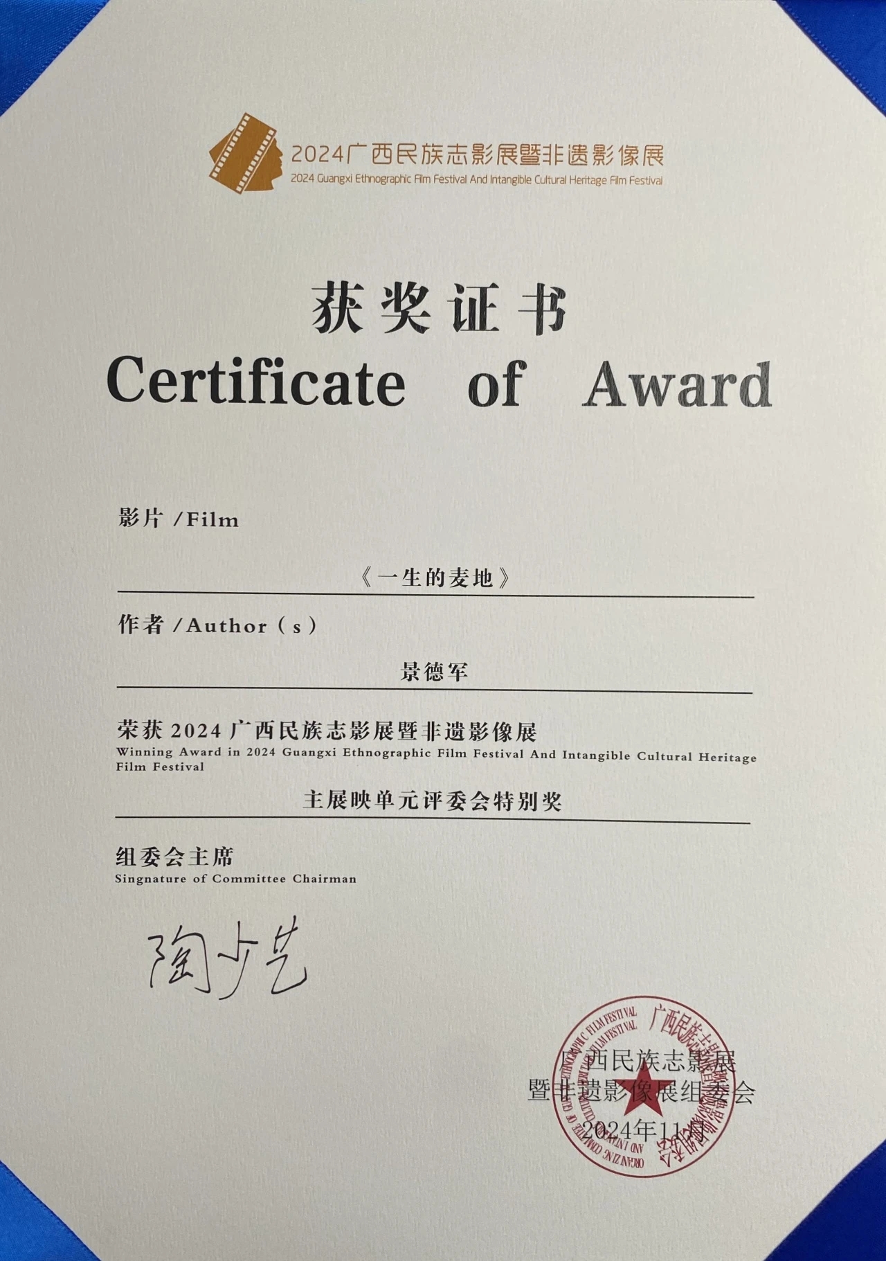 11月24日下午,“2024广西民族志影展暨非遗影像展”在广西民族博物馆落下帷幕。新疆艺术学院传媒学院广播电视编导系主任景德军副教授作品《一生的麦地》获2024广西民族志影暨非遗影像展主展映单元评委会特别奖。