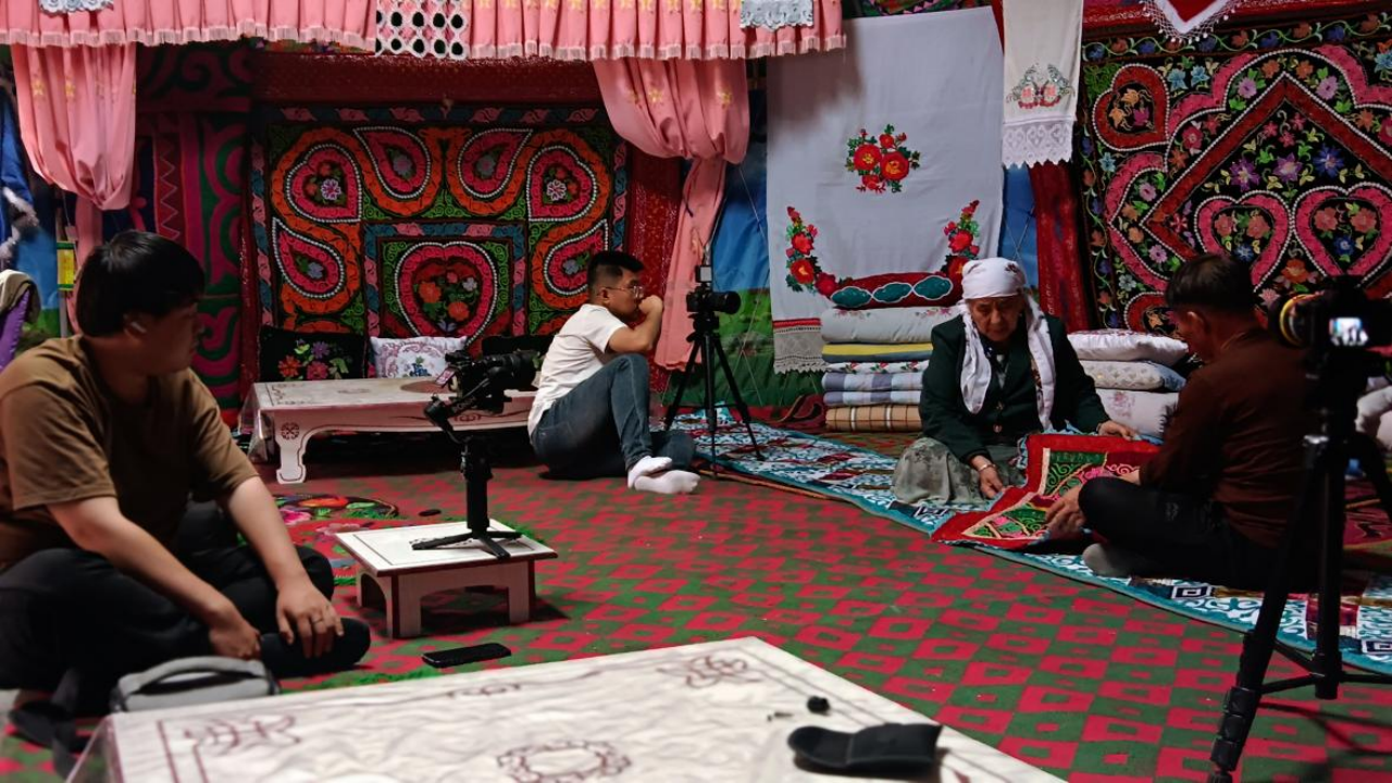 同学们专程去到木垒,用镜头定格哈萨克族刺绣的每一个细微之处。在拍摄过程中,他们看见了在绣娘灵巧的双手下,针线在布料上欢快穿梭的灵动之美,真切感受到了绣品背后蕴含的动人故事与丰富情感,深切体会到了哈萨克族人民的非凡智慧与强大创造力,同时,也惊叹于传统与现代的完美融合。