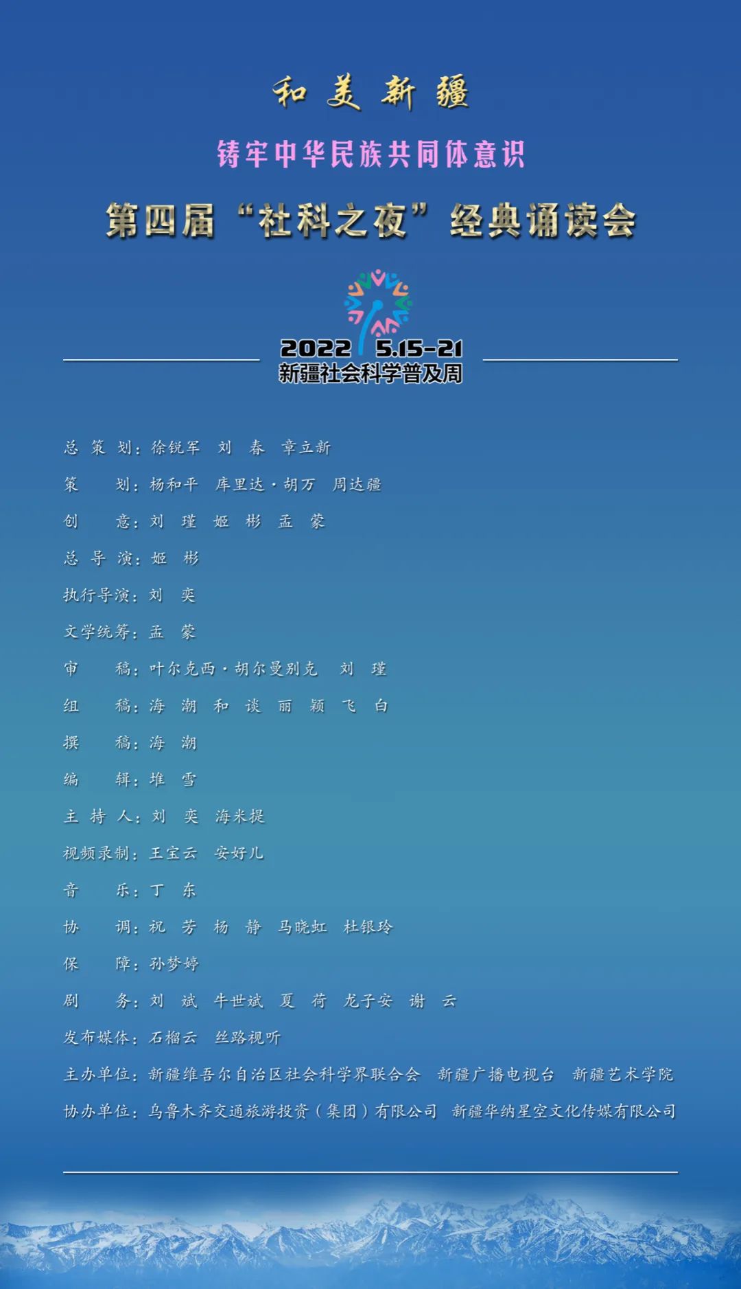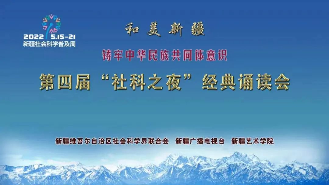 为深入贯彻落实习近平总书记“5.17”在哲学社会科学工作座谈会和第三次中央新疆工作座谈会上的重要讲话精神,切实发挥新时代哲学社会科学培根铸魂的使命作用,培育和践行社会主义核心价值观,以铸牢中华民族共同体意识为主线,不断巩固各民族大团结,新疆维吾尔自治区社会科学界联合会与新疆广播电视台、新疆艺术学院共同主办的2022年新疆社会科学普及周“和美新疆·铸牢中华民族共同体意识·第四届社科之夜经典诵读会”,将于2022年5月18日在石榴云、丝路视听与广大观众见面。