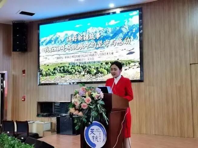 我院播音与主持艺术专业学生古丽迪达尔·艾尔肯以《讲好新疆故事:我在自治区成立70周年主题成就展中的坚守与感动》为题,为师生们作了专题分享,她以视听为媒共话城市的变迁与发展。作为自治区成立70周年主题成就展的优秀讲解员,与师生们分享自承担讲解任务以来的心路历程。她从初次接触讲解工作时的生涩紧张,到通过持续学习和刻苦练习,最终在舞台上绽放自信与风采,这段真实的成长经历深深打动了在场的每一位孩子,让他们看到了坚持与努力的意义。